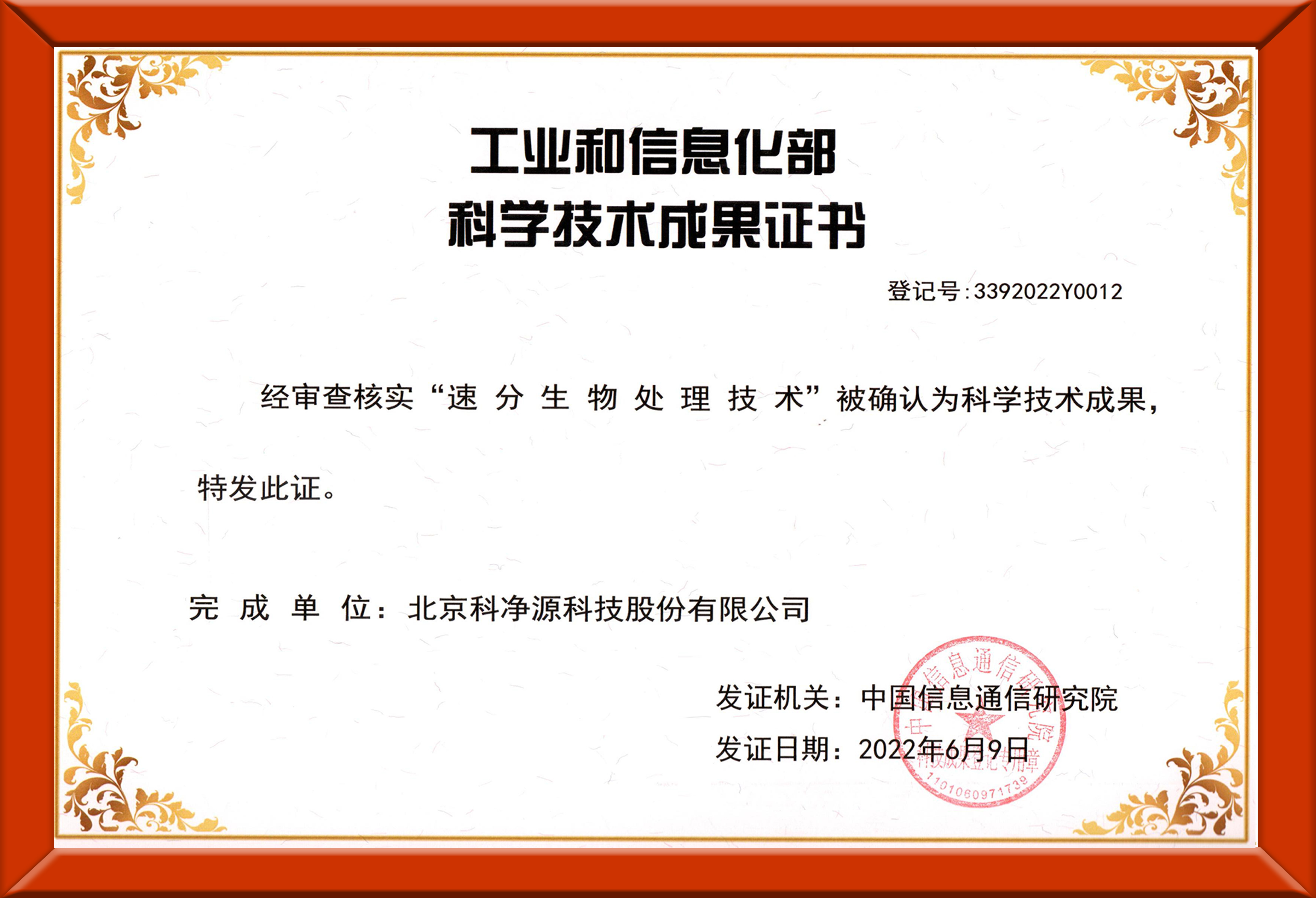 速分處理技術(shù)科學(xué)技術(shù)成果證書